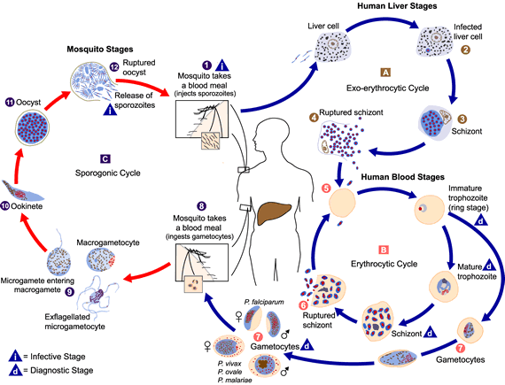 วงจรชีวิตของมาลาเรียเริ่มจากยุงที่มีเชื้อมาลาเรียดูดเลือดคน